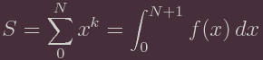 On veut donc calculer la somme S des N premiers entiers chacun élevé à la puissance k mais ça n'est pas évident à priori. L'idée est de passer par une intégrale, c'est toujours plus simple à calculer qu'une somme discrète, mais ça nous oblige à trouver une mystérieuse fonction f telle que :